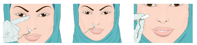 - ابتدا باید تامپون را به آرامی و با دقت داخل حفره بینی قرار دهید و کمی به سمت بالا فشار دهید و از قابل مشاهده بودن نخ ایمنی تامپون مطمئن شوید.